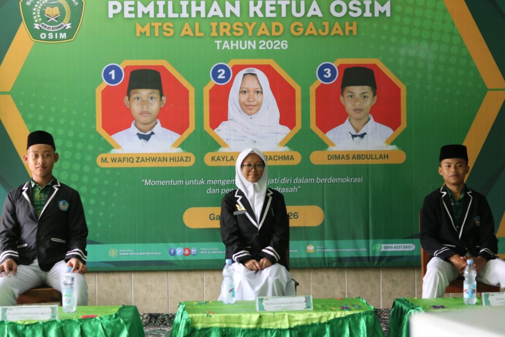 MTs Al Irsyad Gajah melaksanakan kegiatan Pemilihan Ketua Organisasi Siswa Intra Madrasah (OSIM) periode 2026 pada hari Rabu, 7 Januari 2026. Kegiatan ini menjadi bagian dari pembelajaran demokrasi bagi siswa sekaligus sarana menumbuhkan jiwa kepemimpinan dan tanggung jawab organisasi di lingkungan madrasah.